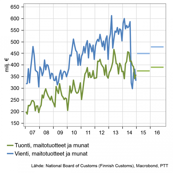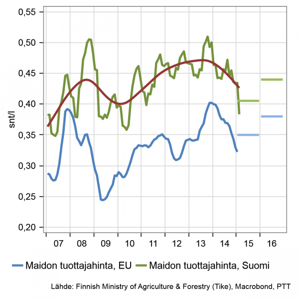EU:n sisämarkkinoilla pahimmat vientimurheet ovat takanapäin. Maito- ja sianlihatuotteille on löytynyt Venäjän tilalle korvaavia markkinoita. Myös sisämarkkinoilla tuottajahintojen lasku on pysähtynyt, mikä osaltaan vähentää tuontielintarvikkeista aiheutuvaa hintakilpailua ja pitää hinnan muutokset maltillisina.