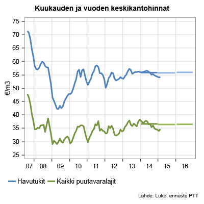 Puun nimellinen vuotuinen keskikantohinta laski noin prosentilla viime vuonna. Kuitupuun hinnat laskivat kaikilla puulajeilla. Tukkien hintakehitys eriytyi: koivutukin hinta nousi, männyn pysyi tasaisena ja kuusen laski. Hankintakauppojen rakennemuutos toi hankintahintoja lähemmäksi kantohintoja.