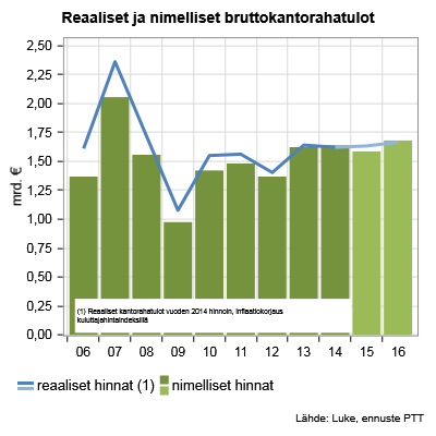 Viime vuonna todettiin erikoinen tilanne puun vuotuisen reaalisen keskihinnan muutoksessa: se sekä laski että pysyi edellisvuoden tasolla. Metsäteollisuuden näkökulmasta puu on kustannuserä, joten on luontevaa käyttää tukkuhintaindeksiä reaalihintaa laskettaessa. Tukkuhintaindeksin muutos oli miinuksen puolella viime vuonna. Tuloksena on reaalisesti vakaana pysynyt keskihinta. Puun myyjä taas arvioi hinnan kehitystä kuluttajahintaindeksin mukaan, joka nousi hieman viime vuonna. Siten puun myyjän näkökulmasta reaalinen hintataso laski edellisvuodesta.