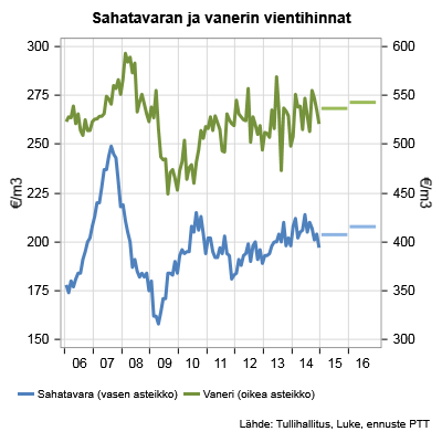 Kireän kilpailun johdosta sahatavaran hinta on ollut paineen alla viime vuoden loppupuolelta lähtien. Euron heikentyminen monien vientimaiden valuuttoihin nähden helpottaa muuten tukalaa tilannetta.