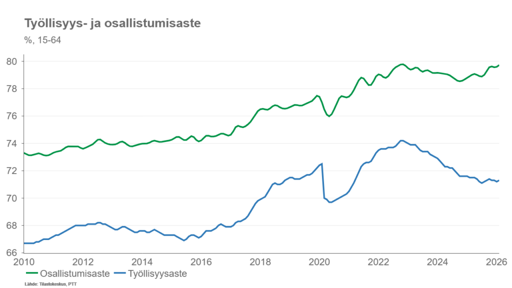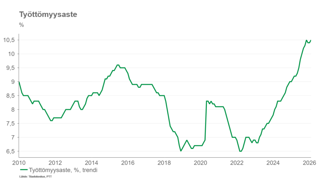 Tilastokeskuksen työvoimatutkimuksen mukaan 15–74-vuotiaita työllisiä oli vuoden 2026 helmikuussa 24 000 enemmän kuin vuosi sitten. Työttömiä oli 49 000 enemmän vuoden takaiseen verrattuna. 15–64-vuotiaiden työllisyysasteen trendiluku oli 71,3 %. 15–74-vuotiaiden työttömyysasteen trendiluku oli 10,5 %.